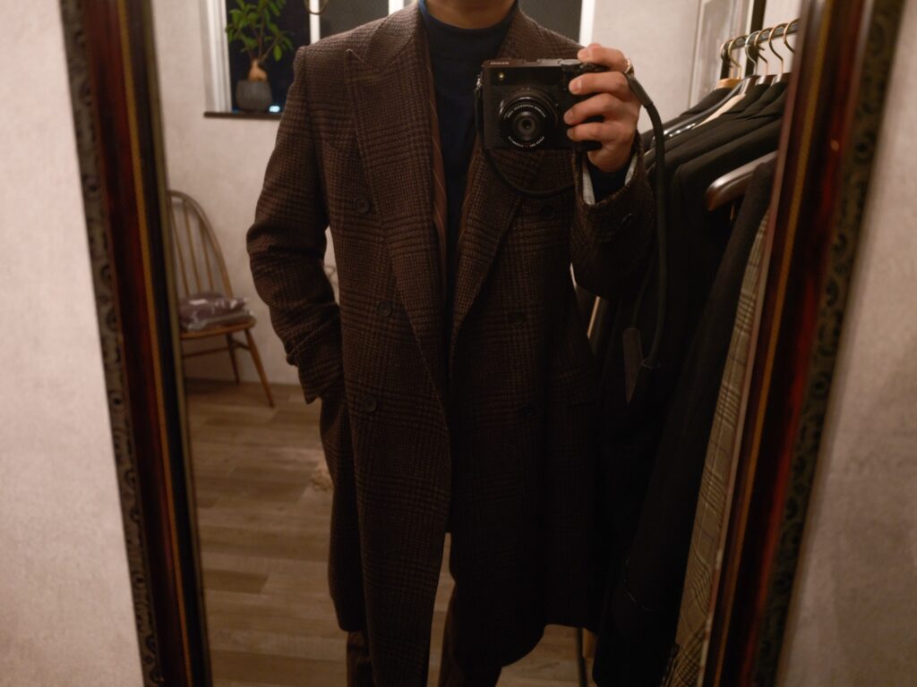 そしていよいよ、2025年11月19日。ビスポークトランク受け取りの日がやってきました。Kっちゃんが福島さんに「オボイストのトランクと自分のバッグ、同じ日に納品してほしい」とお願いしてくれていたので、今回はKっちゃんと、もう一人仲の良い友人のさとしさんと3人で行くことにしていました。さとしさんが車で早朝5時台に迎えに来てくれる段取りでしたが、私はあまりにも楽しみすぎて夜中の1時半に目が覚めてしまい、それから朝まで一睡もできませんでした。こんなにも納品が楽しみなのは久しぶりです。この日の東京はとても冷えるとのことだったので、TTBOCOATの3rdサンプル、スミスウールンズのボタニーで作ったTTBOSUIT匠、ジョンスメドレーのタートルネックという出立ちでした。茶色のトランク納品に合わせて、おのずとコーディネートもブラウンになります。