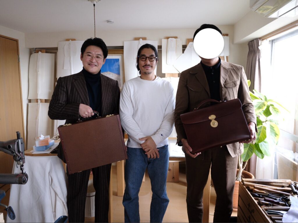 アトリエをバックに三人で記念撮影。2025年は1月にFugeeのバッグ受け取りから始まりましたが、最後にもこんなに素晴らしいバッグが待っていたとは。まさに鞄の一年でしたね。